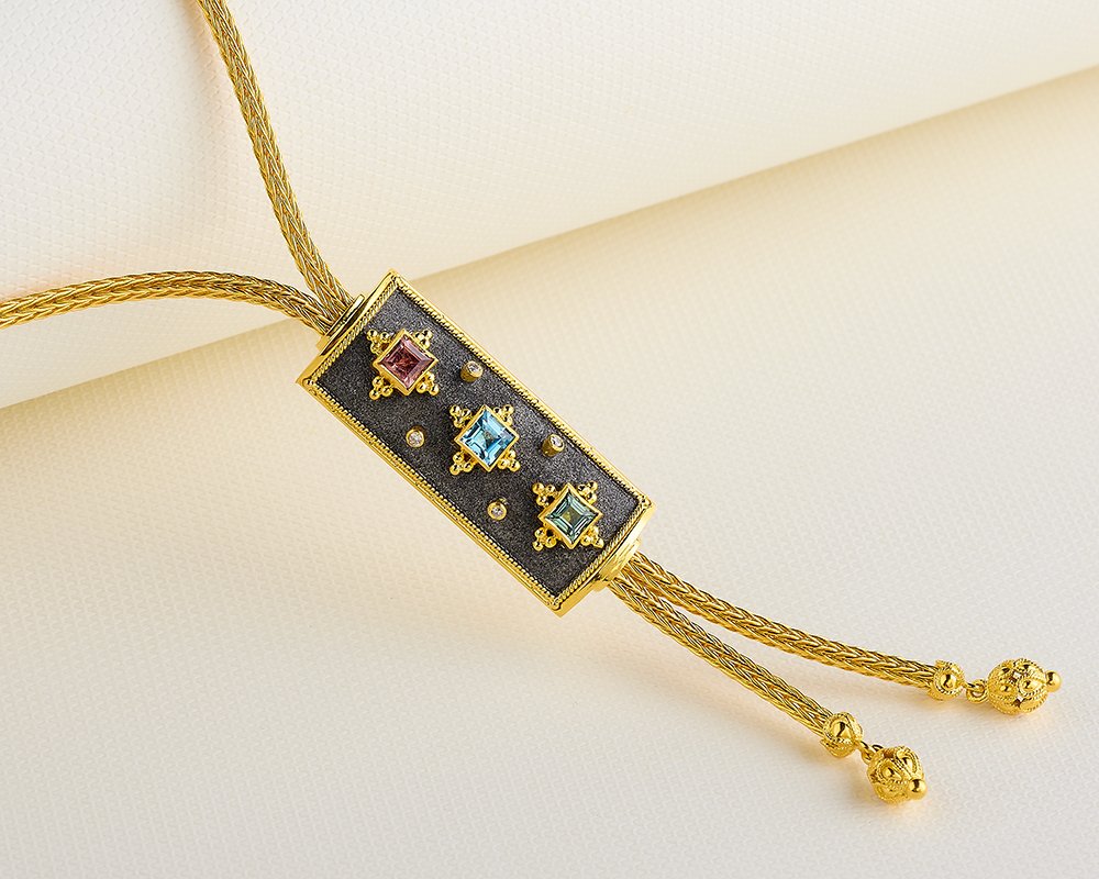 Damaskos Byzantine 18K Gold Necklace with blue topaz, pink & green tourmalines